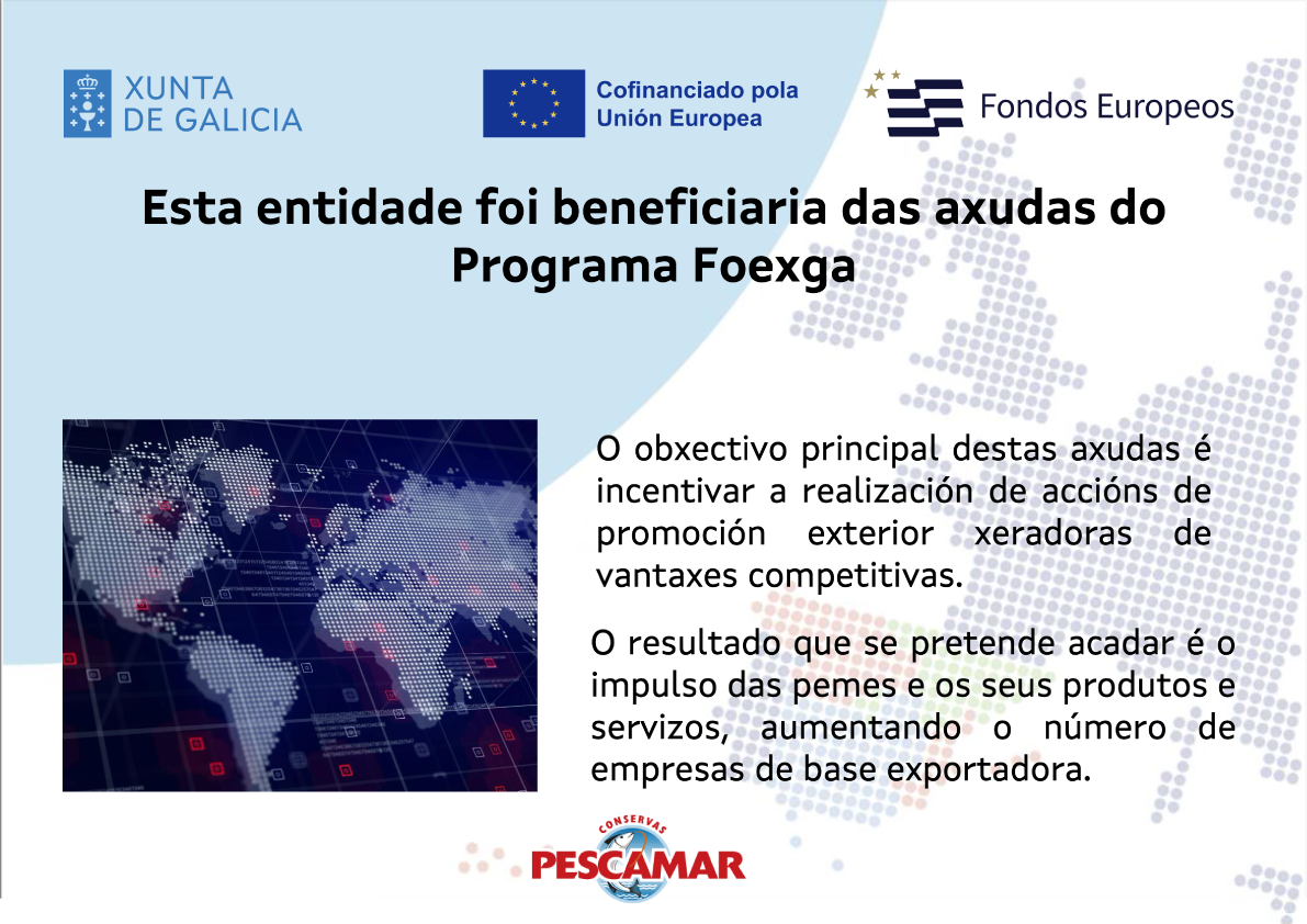 Esta acción de promoción internacional ha sido posible gracias al apoyo financiero de la Unión Europea, a través del PROGRAMA FOEXGA (Fomento de las Exportaciones Gallegas), cofinanciado por el Programa Operativo FEDER Galicia 2021–2027. Este respaldo ha permitido a Pescamar reforzar su presencia en un evento de alcance mundial y continuar posicionando los productos gallegos del mar en los principales mercados internacionales.